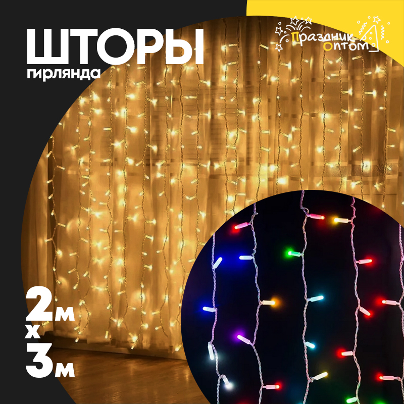 гирлянда 2 х 3 шторы белый провод (цветной)