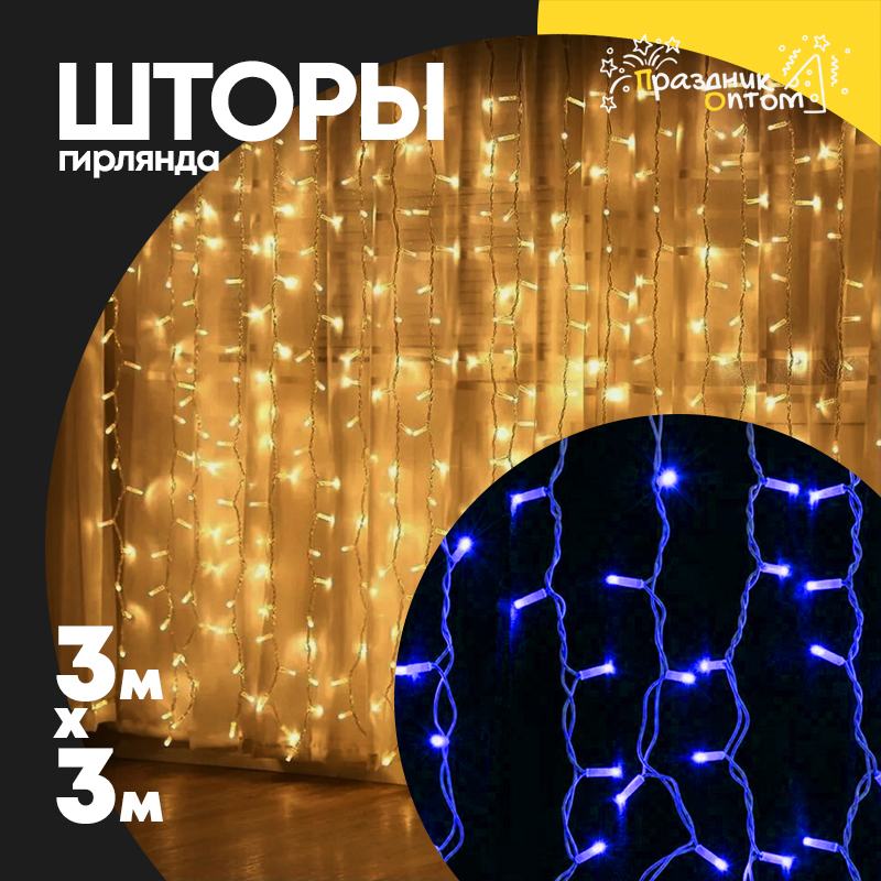 гирлянда 3 х 3 шторы белый провод (синий)
