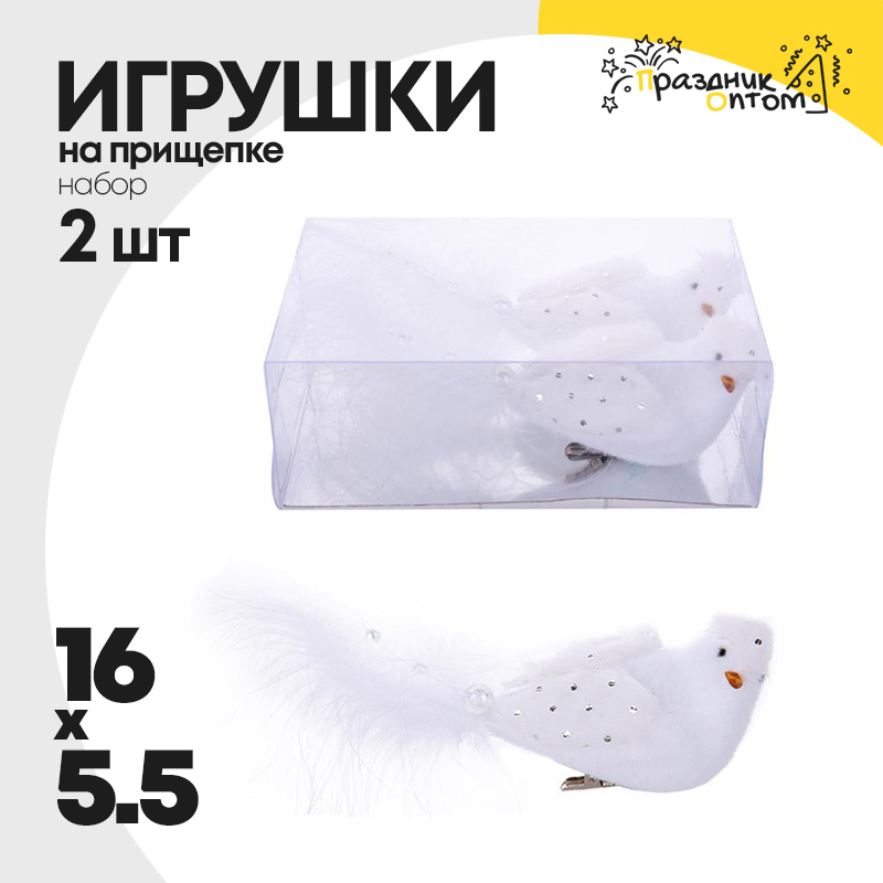 игрушка елочная 2шт набор на прищепке 16см птичка (белый)