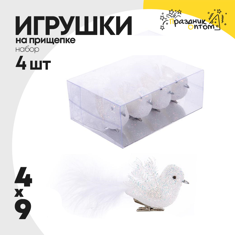игрушка елочная 4шт набор на прищепке 9см птичка (белый)