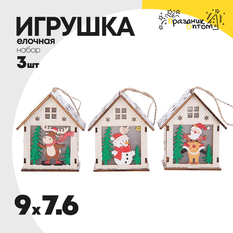 игрушка елочная 7.6 х 9 набор 3шт светящаяся 9см домик (дерево)