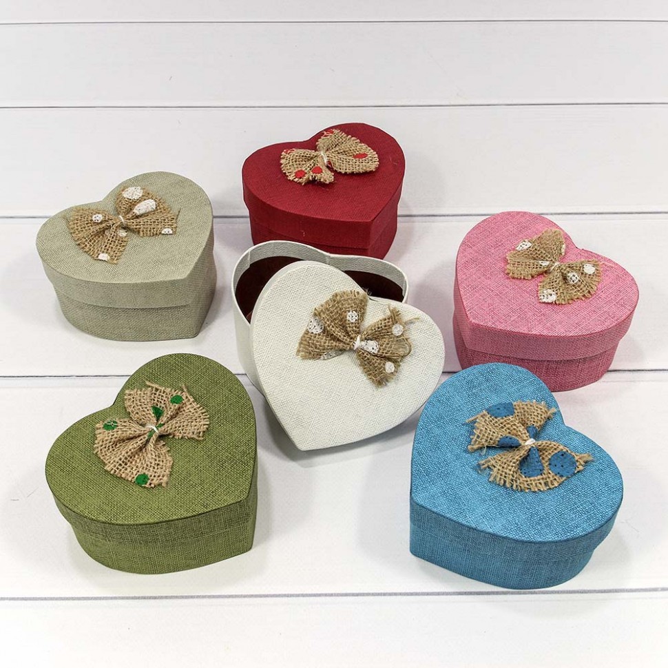 Коробка 11х9.5х5.5 см Набор 6 шт "Сердце" с льняным бантом (Серый, Белый, Голубой, Зеленый, Красный, Розовый)