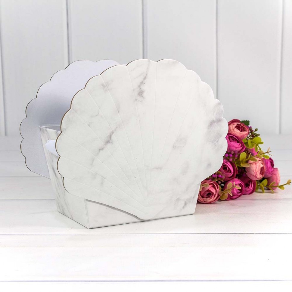 Коробка 19х12.5х16 см "Мрамор" Ракушка с репсовыми ручками (Белый)