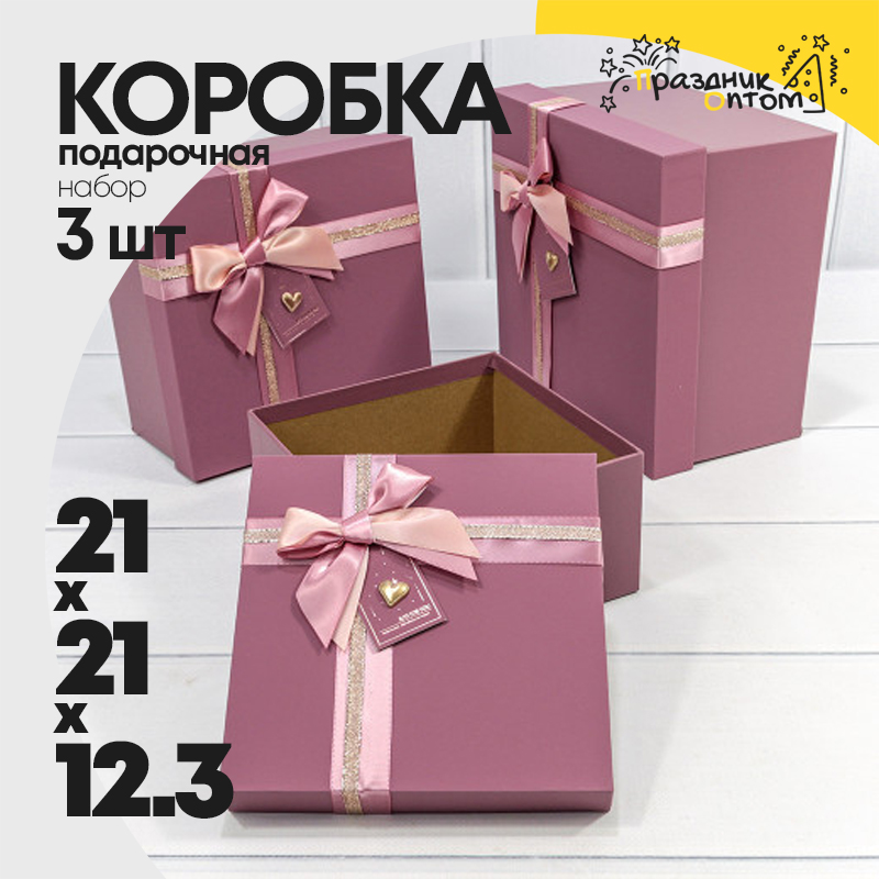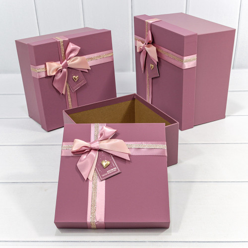 Коробка 21х21х12.3 см Набор 3 шт с двойным бантиком и сердечком (Лиловый)
