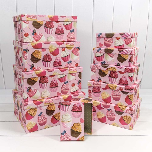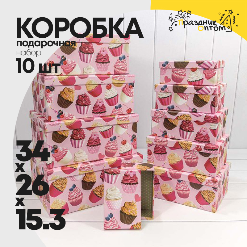 Коробка 34х26х15.3 см Набор 10 шт "Пирожные на розовом фоне" (Розовый)