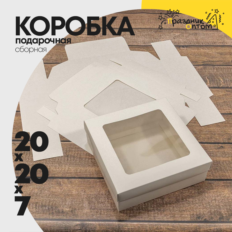 Коробка Для конфет сборная 20х20х7 см с окошком (Белый, Крафт)