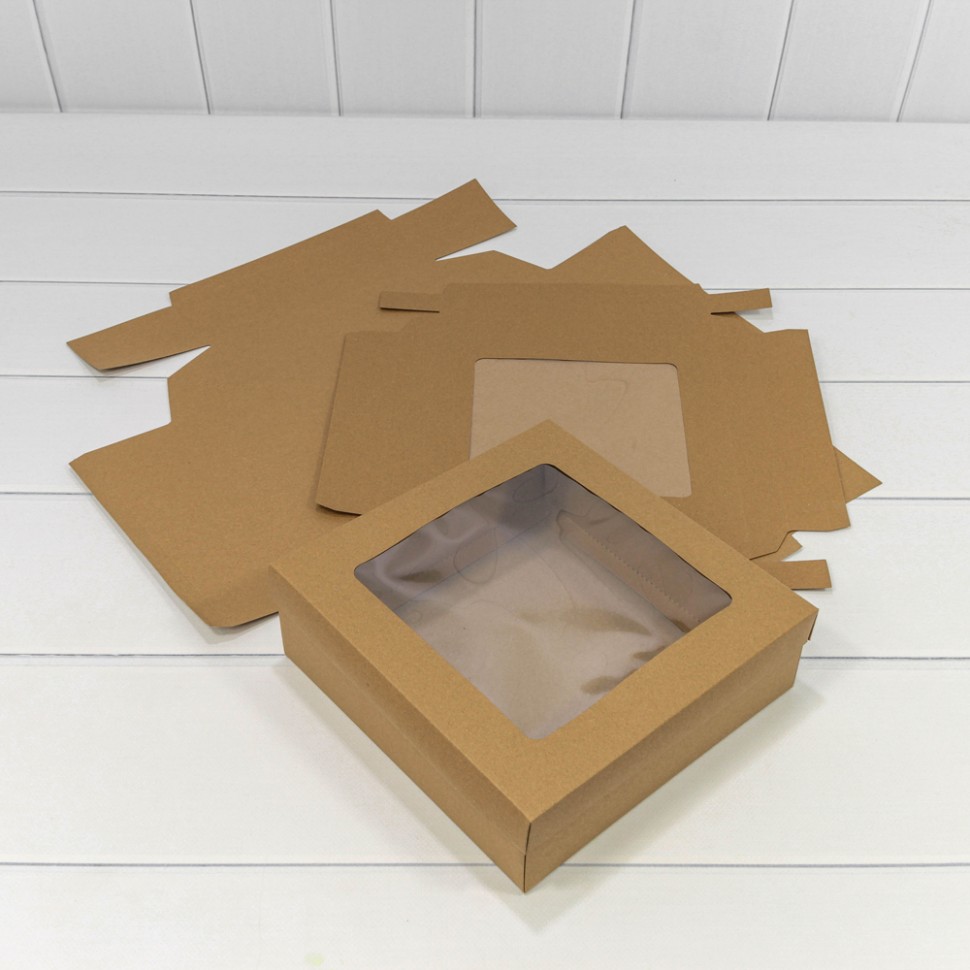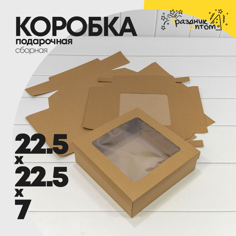 Коробка Для конфет сборная 22.5х22.5х7 см с окошком (Коричневый, Крафт)
