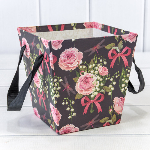 Коробка Ваза для цветов 14.5х14.5х15 см "Ландыши и розы" с ручками (Черный)