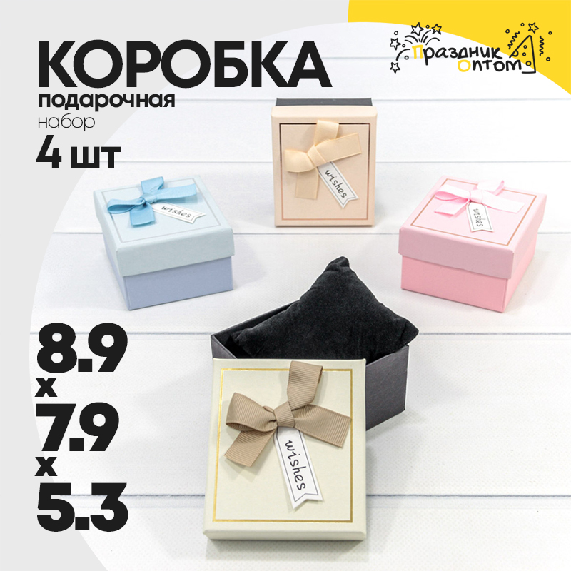 Коробка Ювелирная 8.9х7.9х5.3 см Набор 4 шт с бантиком и подушкой (Микс)