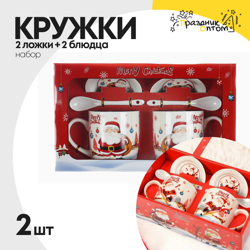 кружка + 2 блюдца + 2 ложки 2шт новогодняя набор (белый)