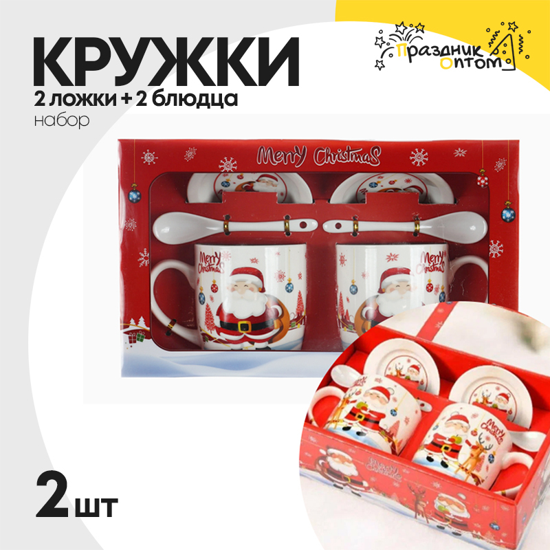 кружка + 2 блюдца + 2 ложки 2шт новогодняя набор (белый)