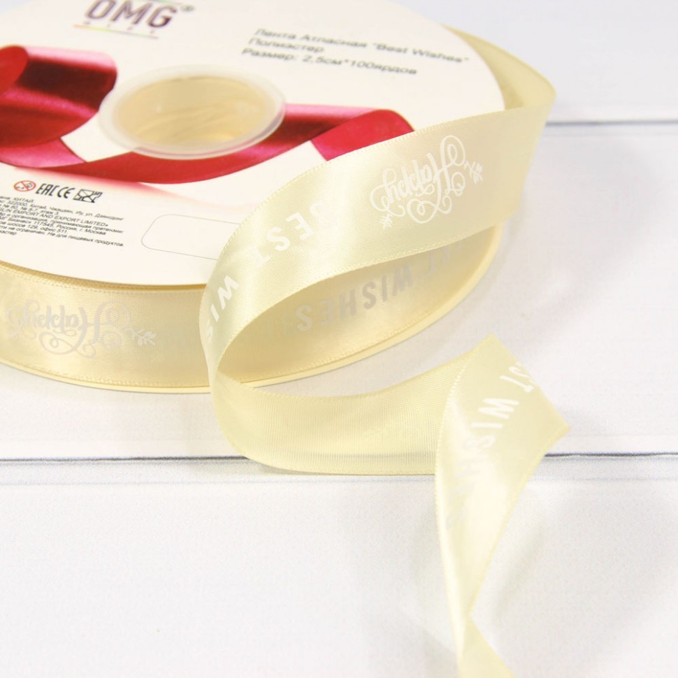 Лента Атласная 2,5см х 110м Полиэстер "Best Wishes" с печатью (Бежевый)