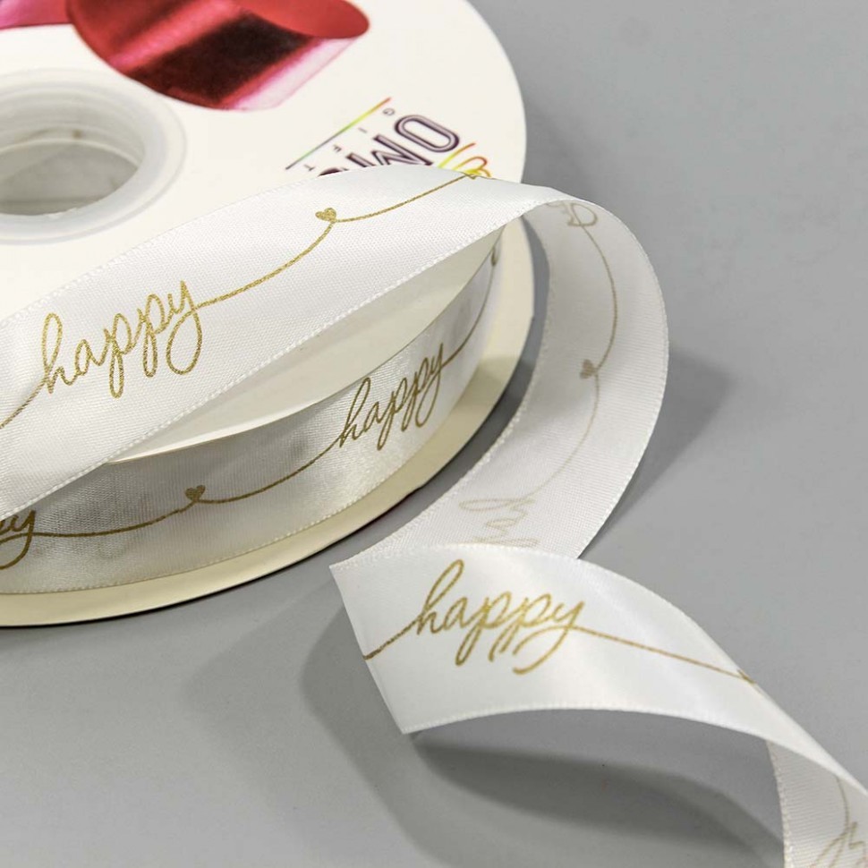 Лента Атласная 2,5см х 110м Полиэстер "Happy" с печатью (Белый)