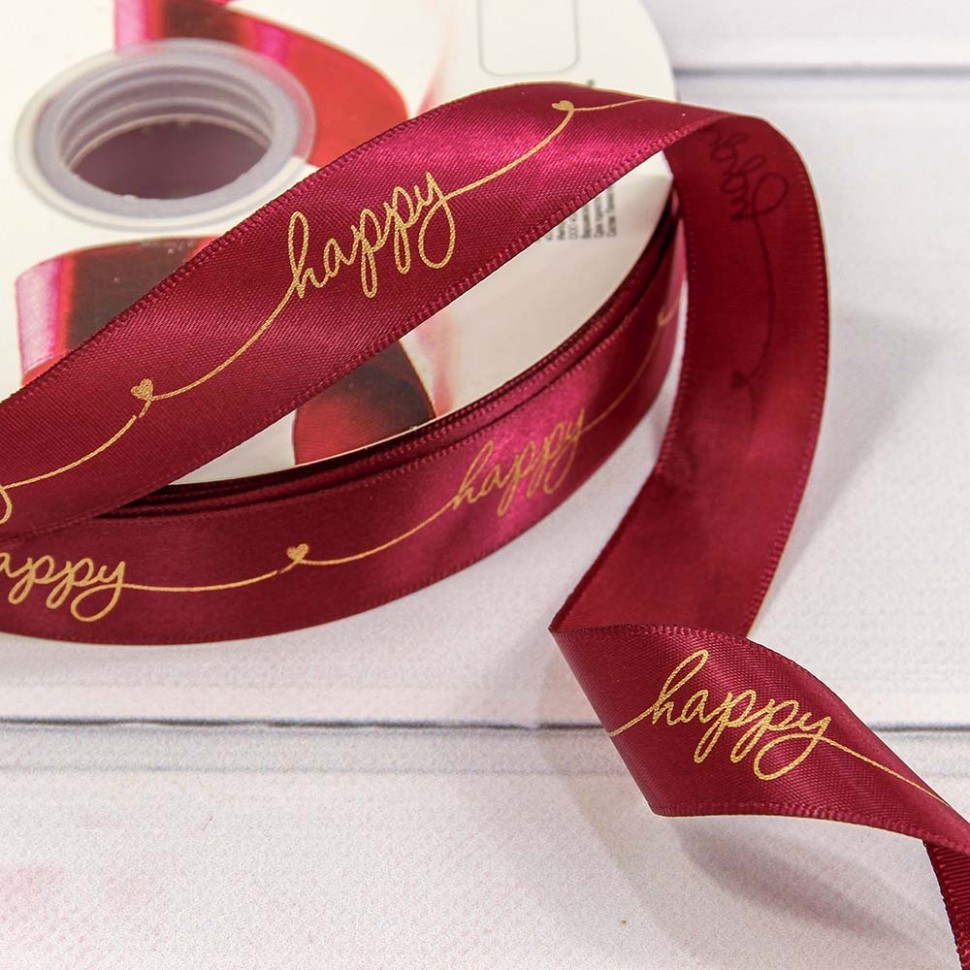 Лента Атласная 2,5см х 110м Полиэстер "Happy" с печатью (Красный)
