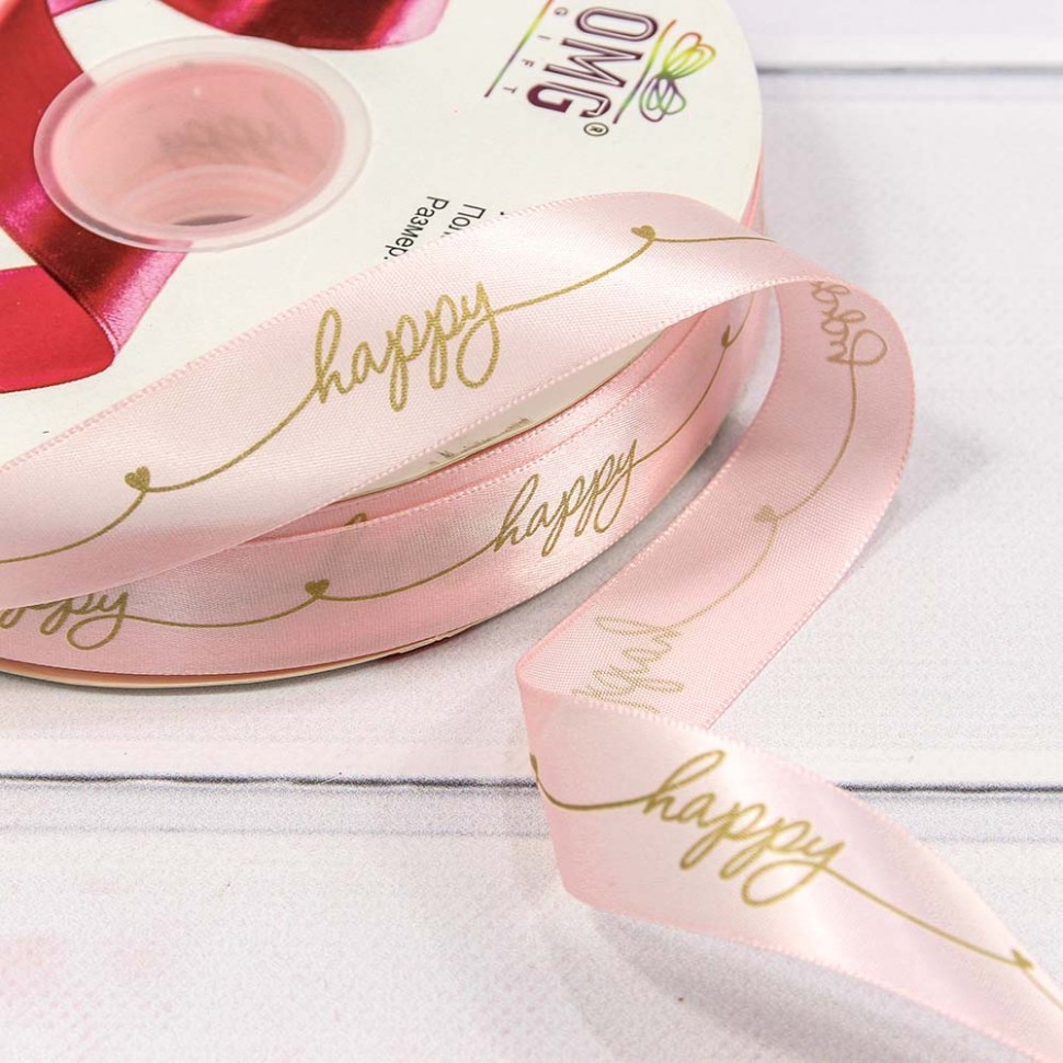 Лента Атласная 2,5см х 110м Полиэстер "Happy" с печатью (Розовый)