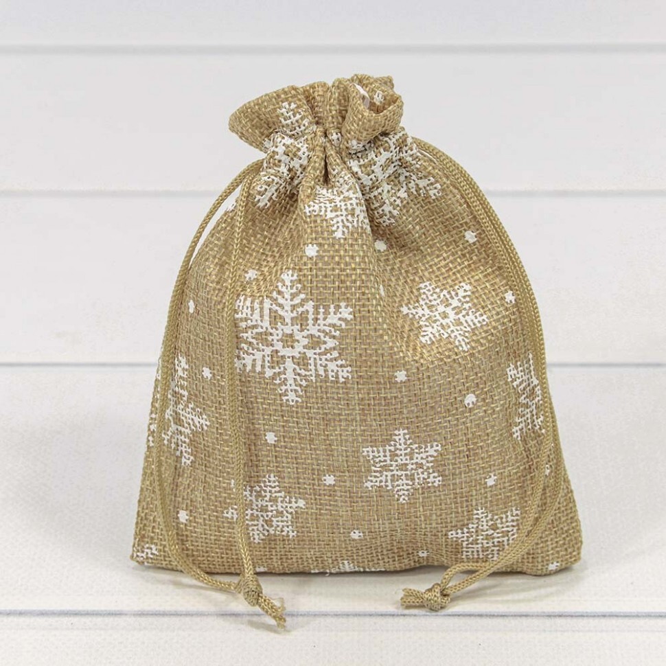 Мешочек 12 х 15 см "Снежинки" с рисунком искусственный лен (коричневый)