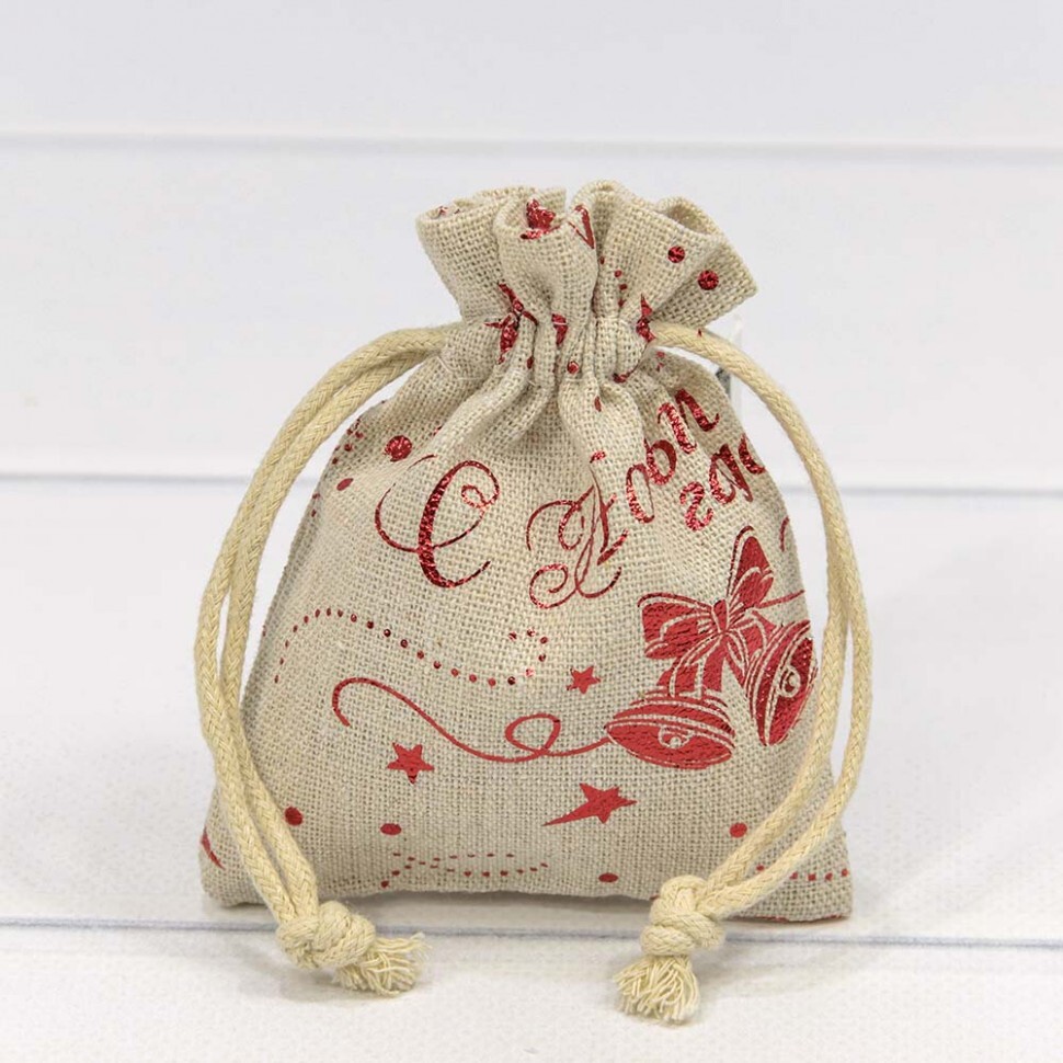 Мешочек 9 х 12 см "С новым годом" с рисунком искусственный лен (коричневый)