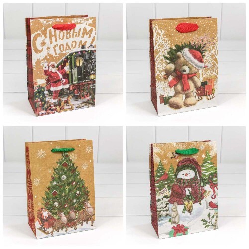 Пакет подарочный 14 х 20 х 8 см Набор 4 шт "Новогодний" (Крафт)