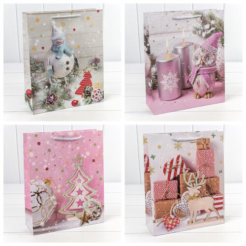 Пакет подарочный 26 х 32 х 10 см Набор 4 шт "Новый год" (Розовый)