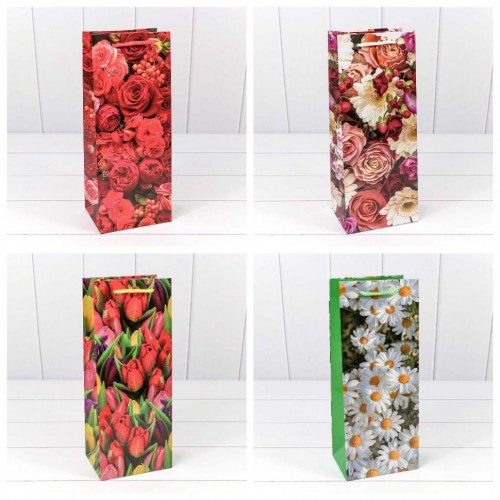 Пакет подарочный Под бутылку 14х35х11см "Цветы" (Микс)
