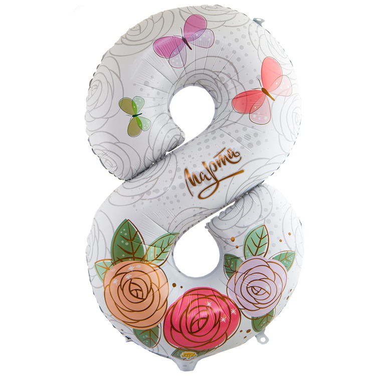 Шар Фольгированный Цифра 8 МАРТА Розы (Белый)