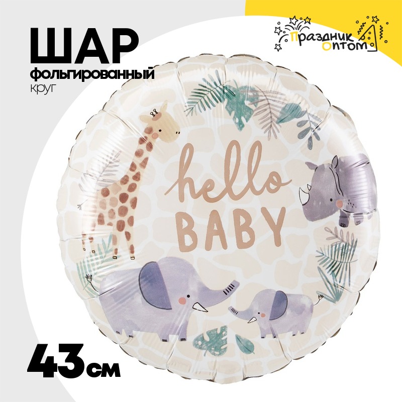 Шар Фольгированный HELLO BABY Жираф Слон Носорог (Белый)