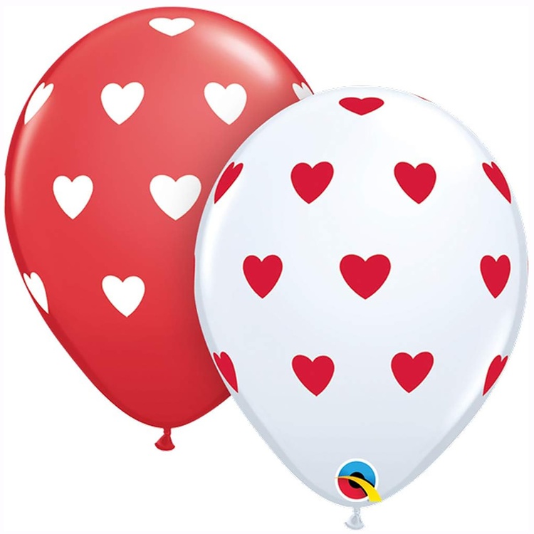 Шар латексный 28см Сердца большие (Красный, Белый)