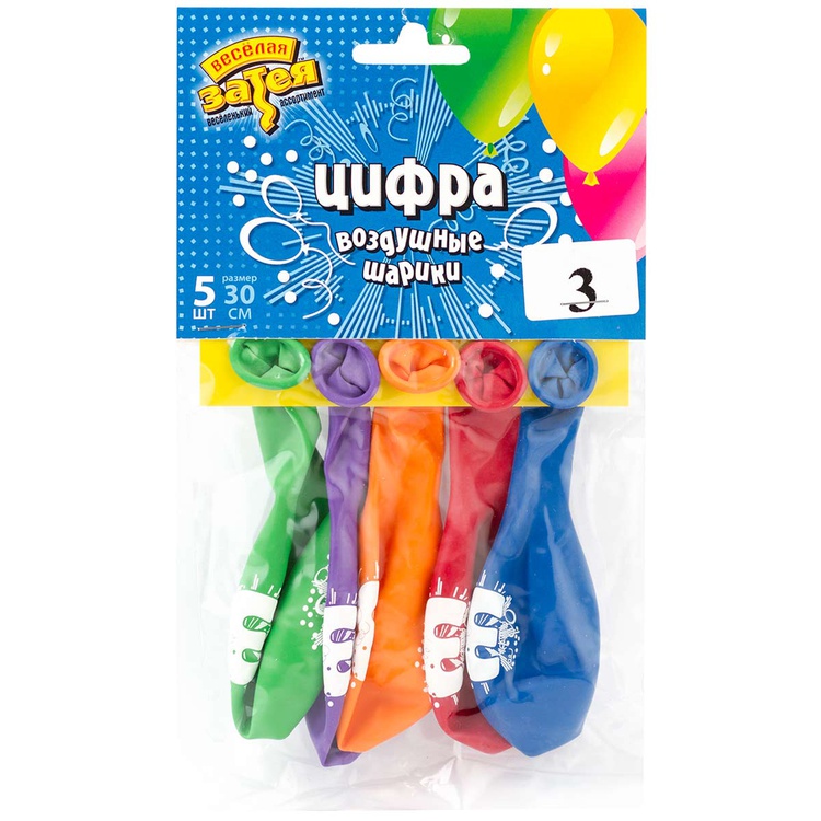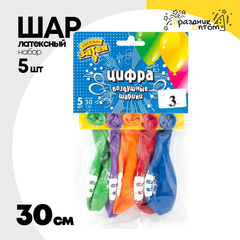 Шар латексный 30см Набор 5шт Цифра 3 (Ассорти)