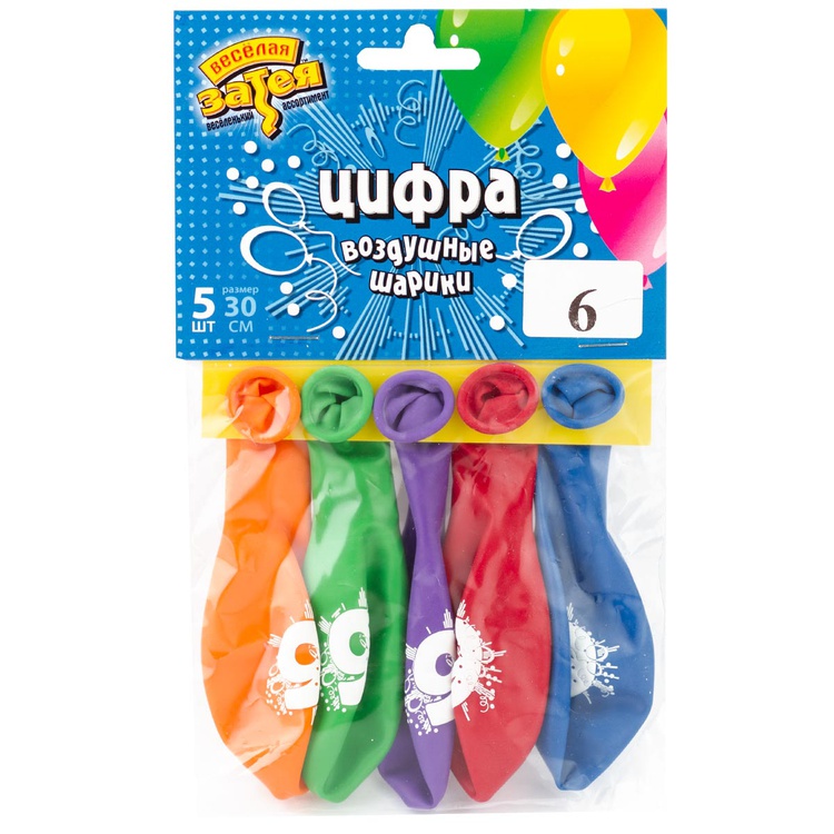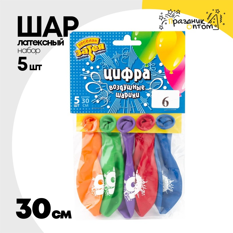 Шар латексный 30см Набор 5шт Цифра 6 (Ассорти)
