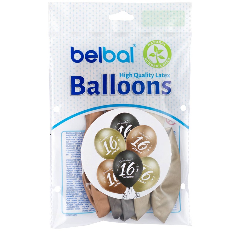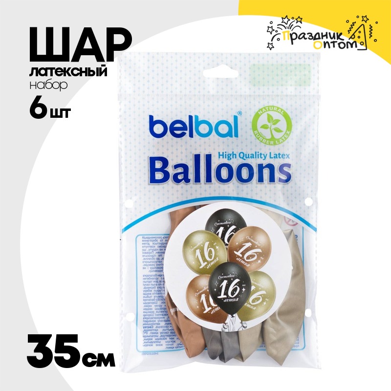 Шар латексный 35см Набор 6 шт Юбилей - 16 (Ассорти)