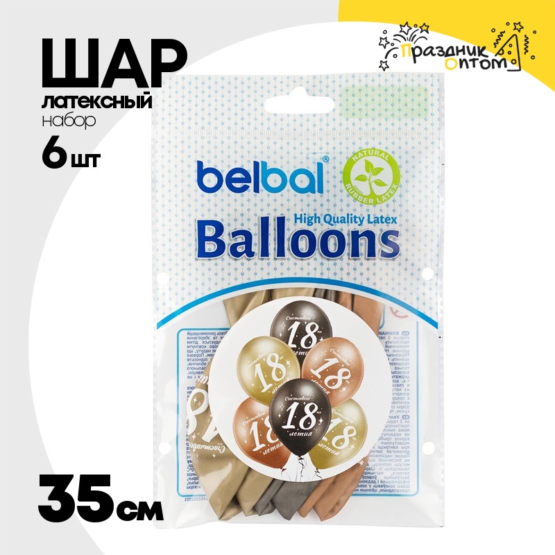 Шар латексный 35см Набор 6 шт Юбилей - 18 (Ассорти)