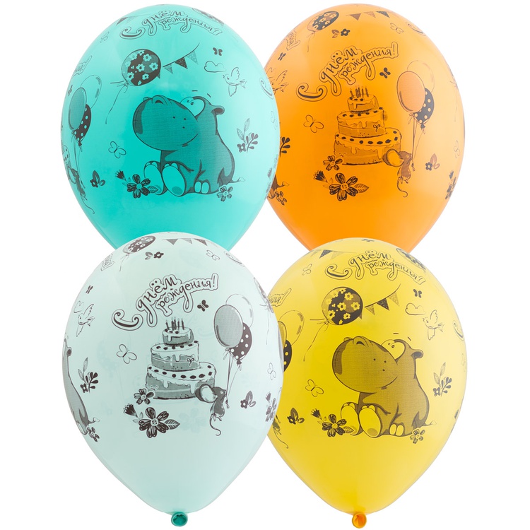 Шар латексный 35см С ДР! Бегемот с тортом (Ассорти)