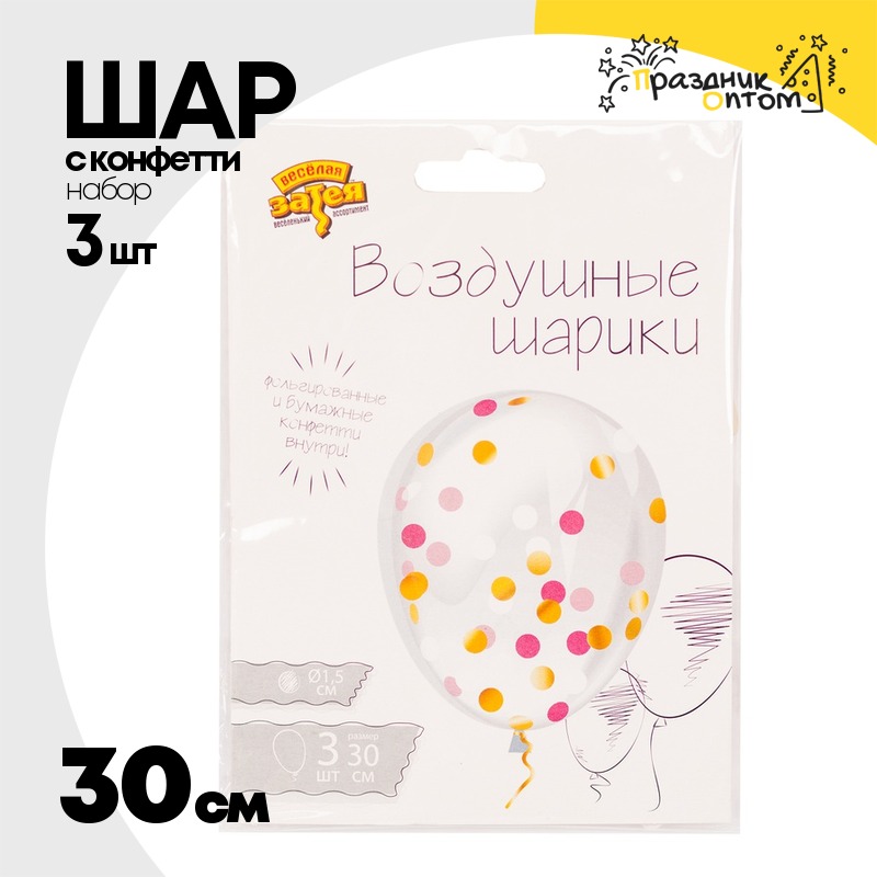 Шар латексный С конфетти Набор 3 шт Кристалл 30 см (Прозрачный)